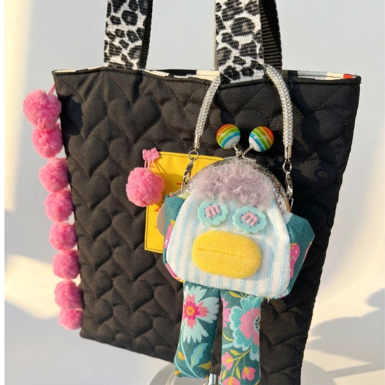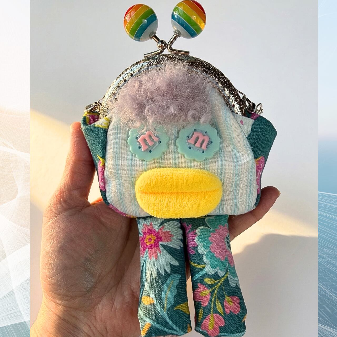インパクト大のキャラクター: ぷっくりした黄色いタラコ唇、レインボーカラーの金具玉(つまみ)、そして花柄のシュールな「脚」。どこをとっても個性の塊です!