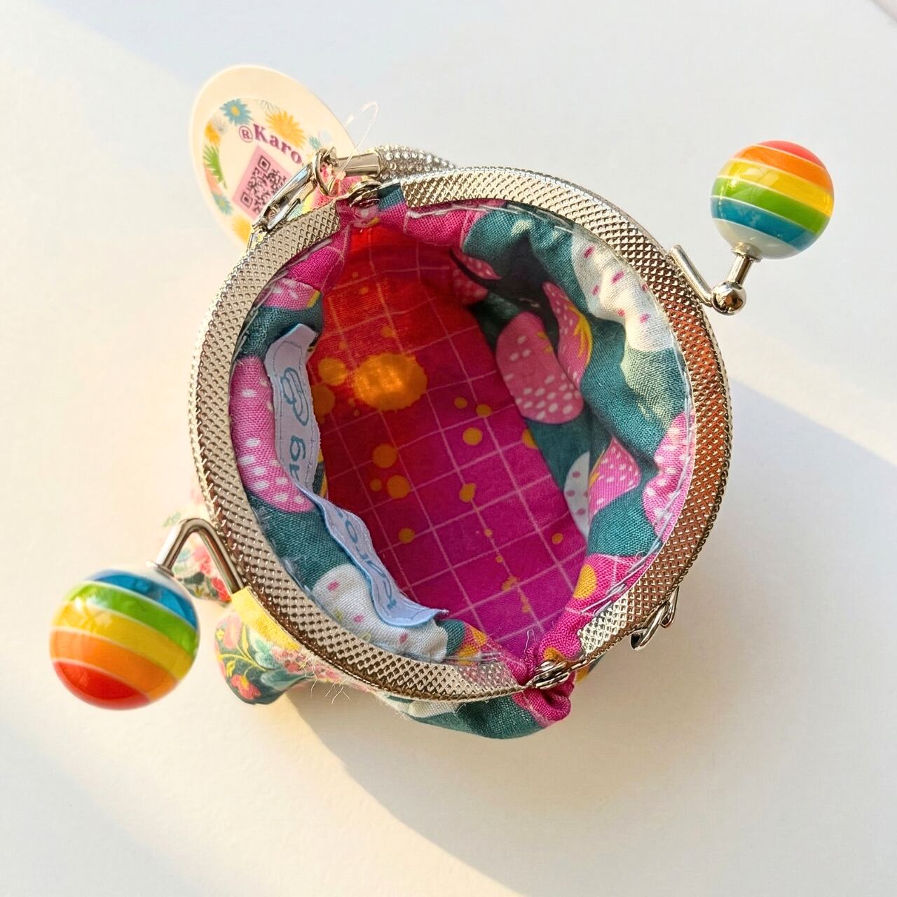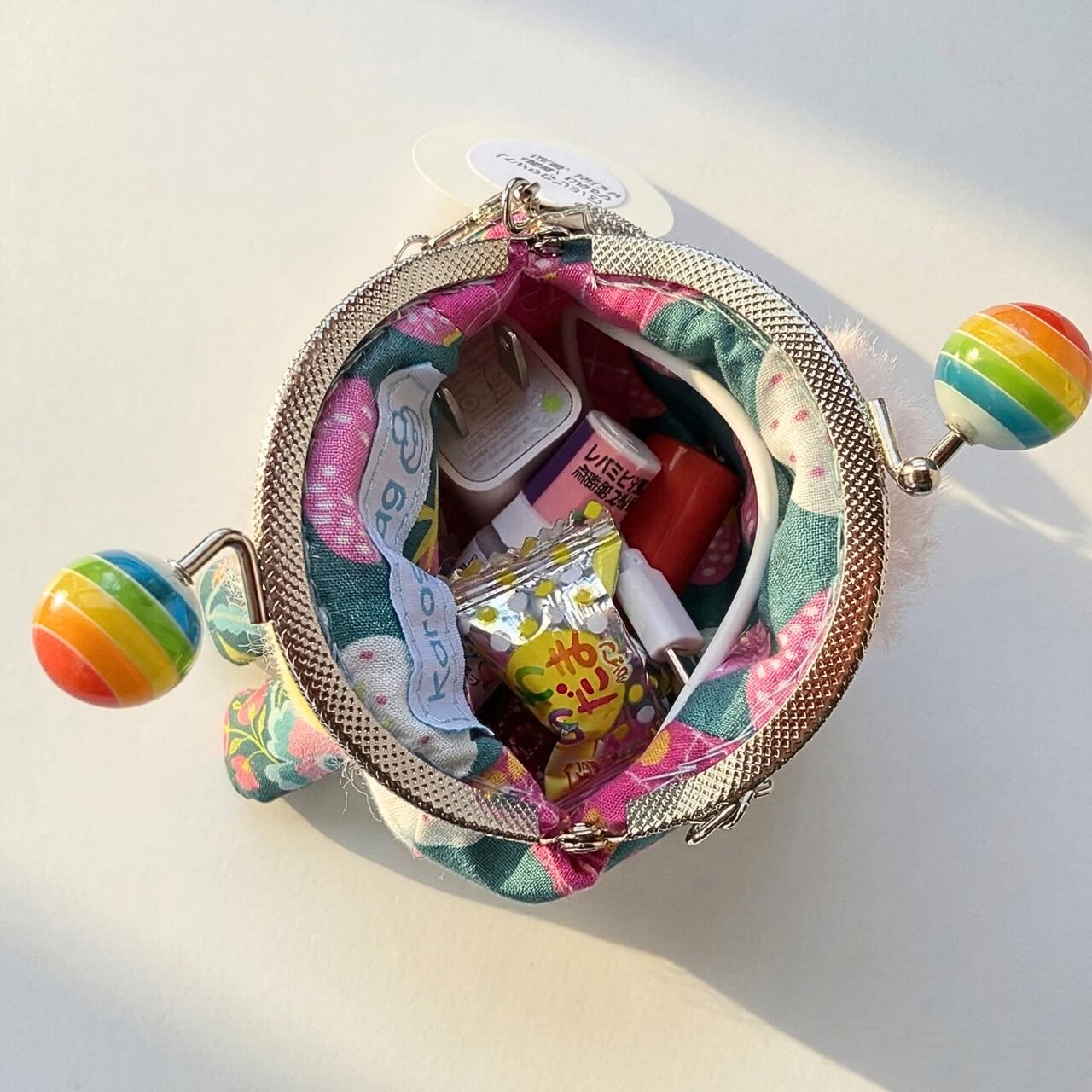 内布まで抜かりなし: がま口を開けると、中にはポップなピンク×イチゴ柄の世界が広がります。開けるたびに自分だけがニヤリとしてしまう隠れたこだわりです。